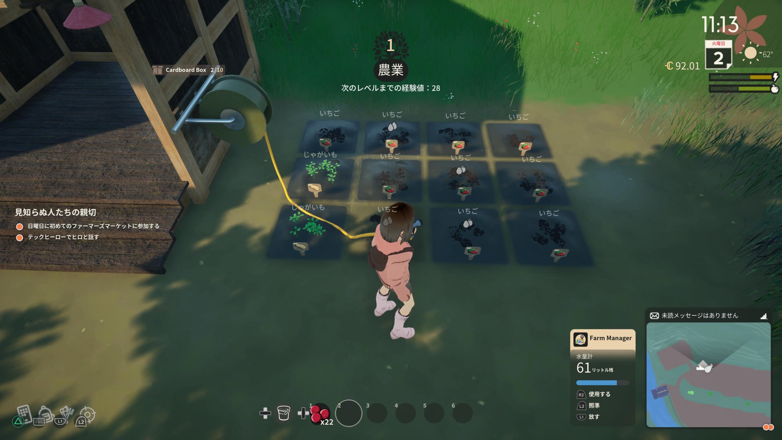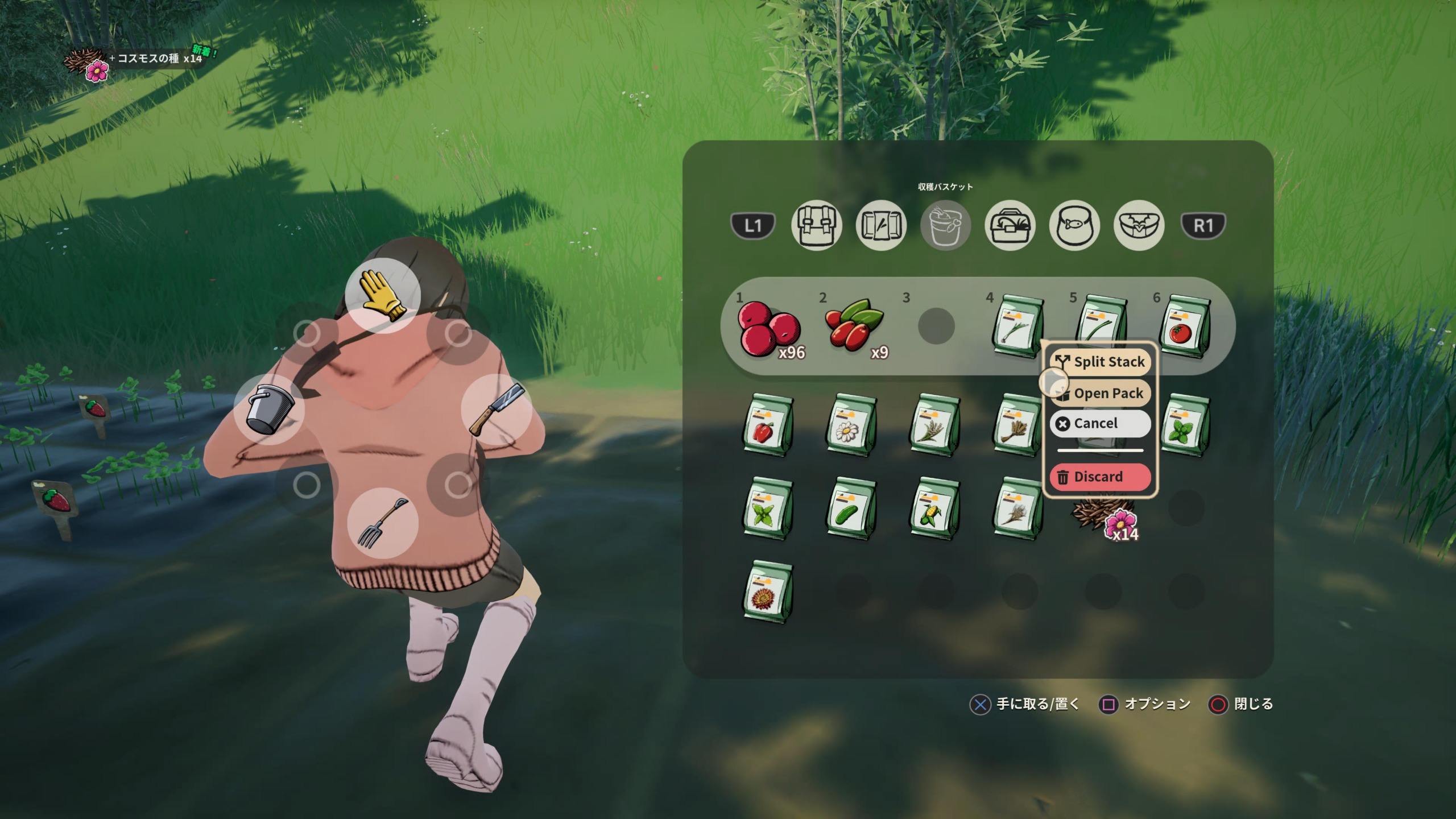 - リュックを開いて種のパックにカーソルを合わせて□ボタン。