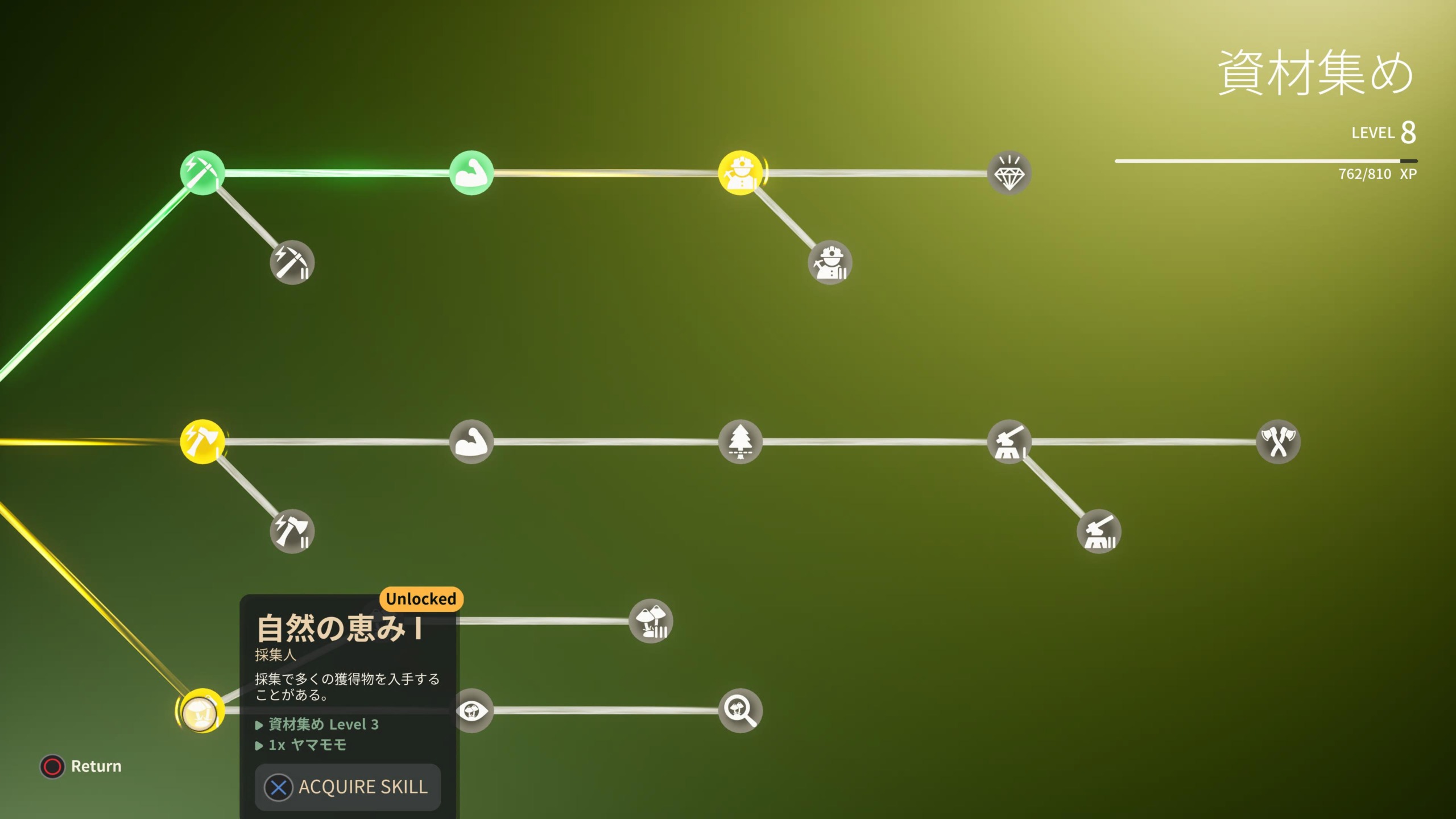 スキルはスキルレベルを上げ、指定のアイテムを奉納することで習得可能。