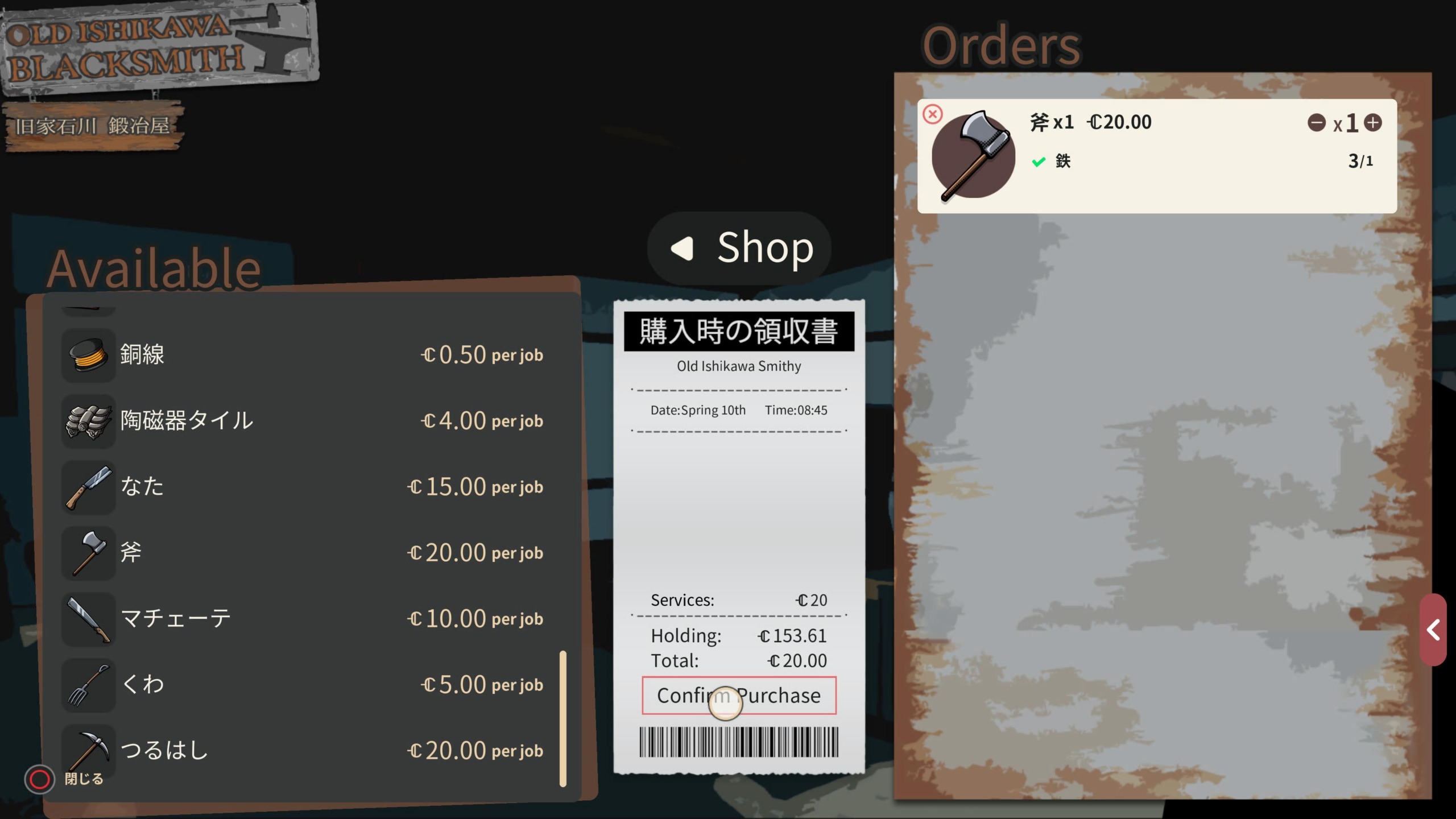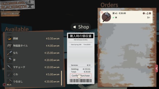 星製材所でフィリップ、鍛冶屋でイシカワ名人と話してイベントを進めていくと、マチェーテとつるはしが手に入りました。洞窟で鉄を採掘した後、鍛冶屋で斧を注文。